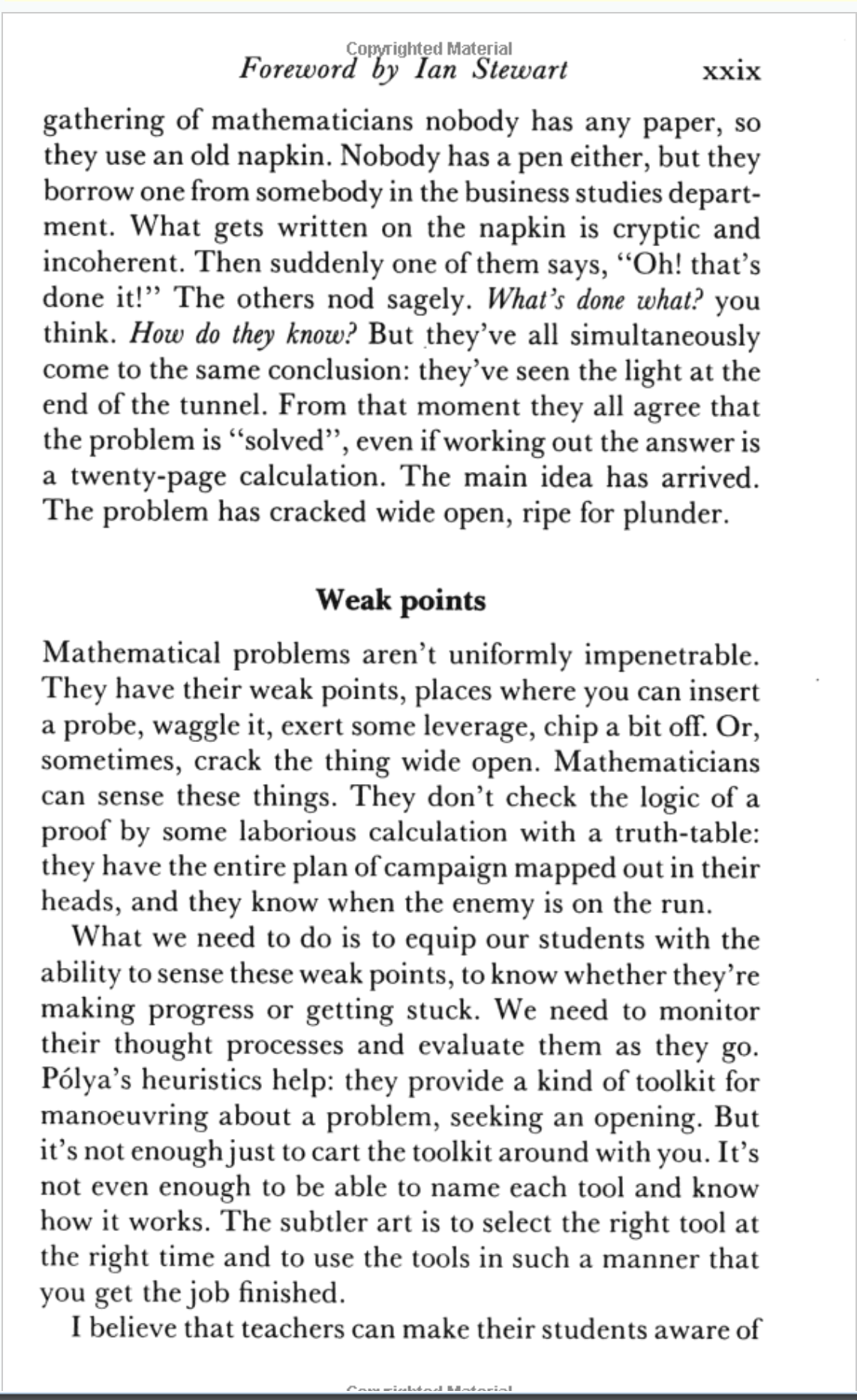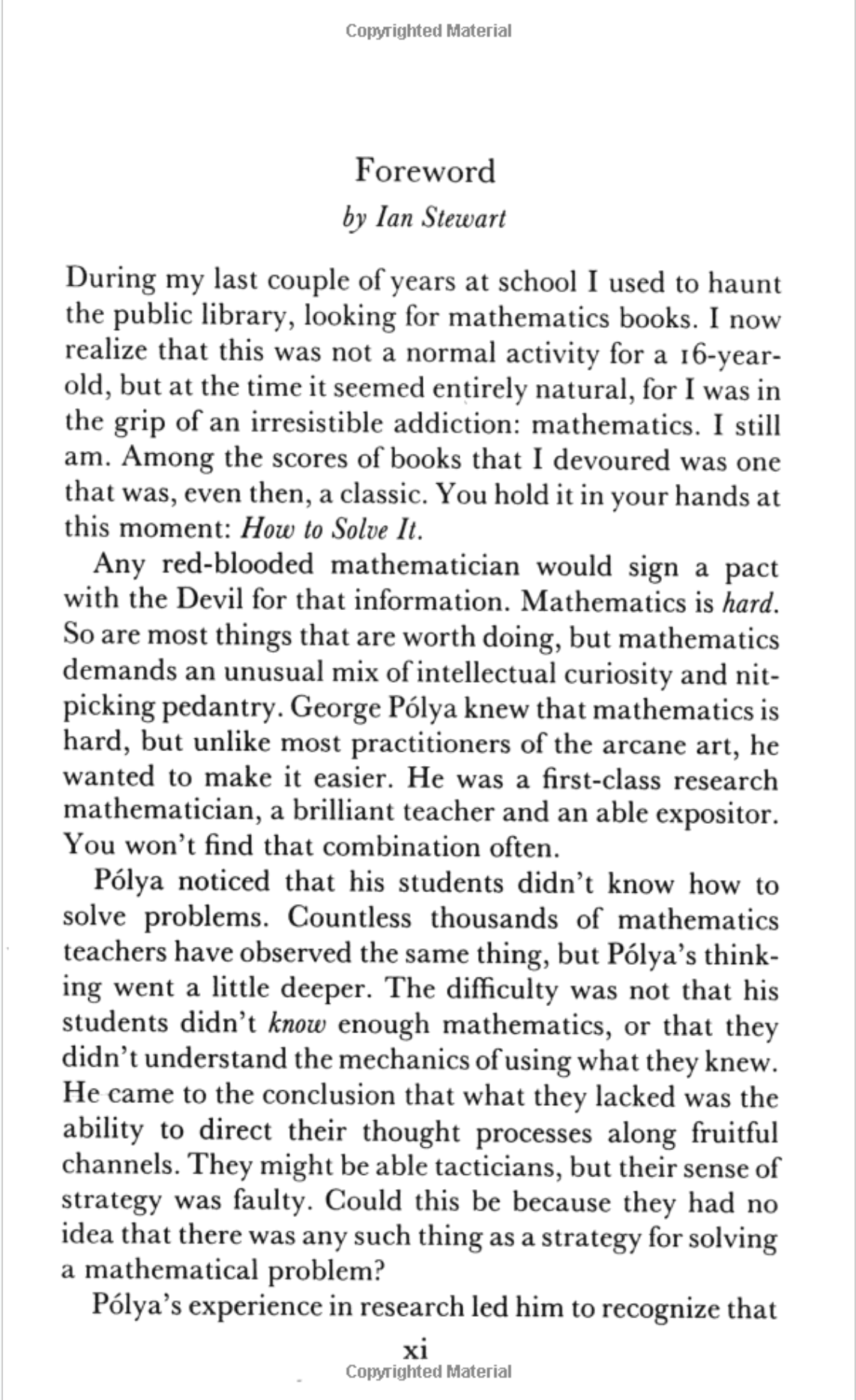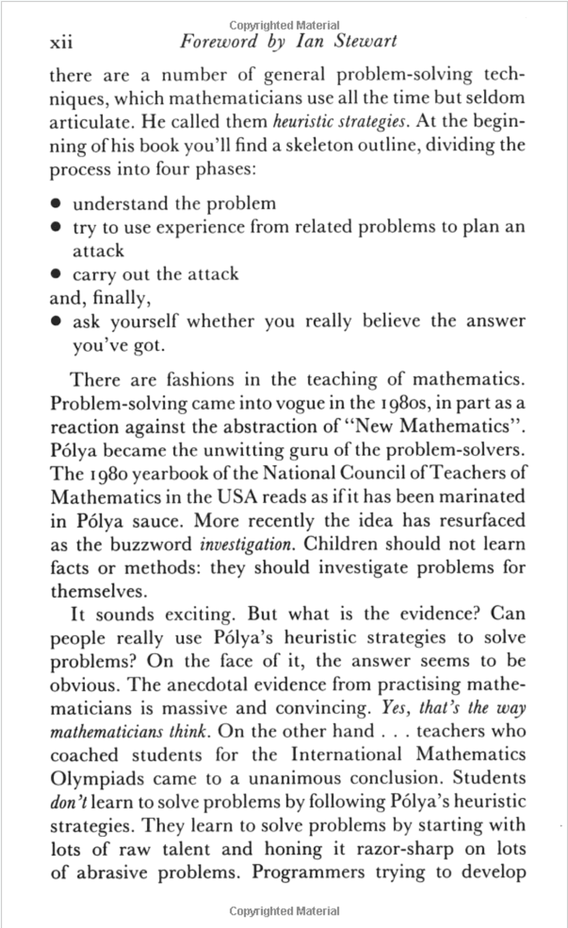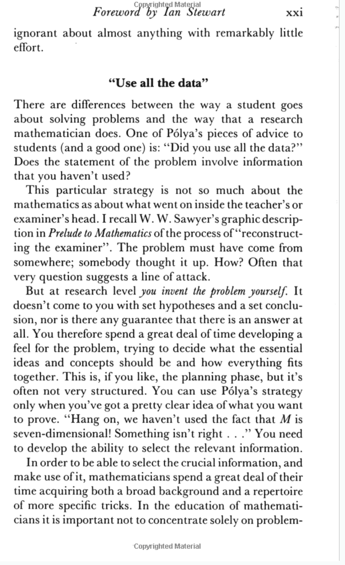 Last year I stumbled across a book that I had heard of in the university library, the 1990 edition of How to Solve It by George Polya. The book itself was good, but nothing I didn't expect. However the foreword keeps coming back to me, to the extent that I find myself looking it up a year later. I managed to find it online so here it is if you want to read it: