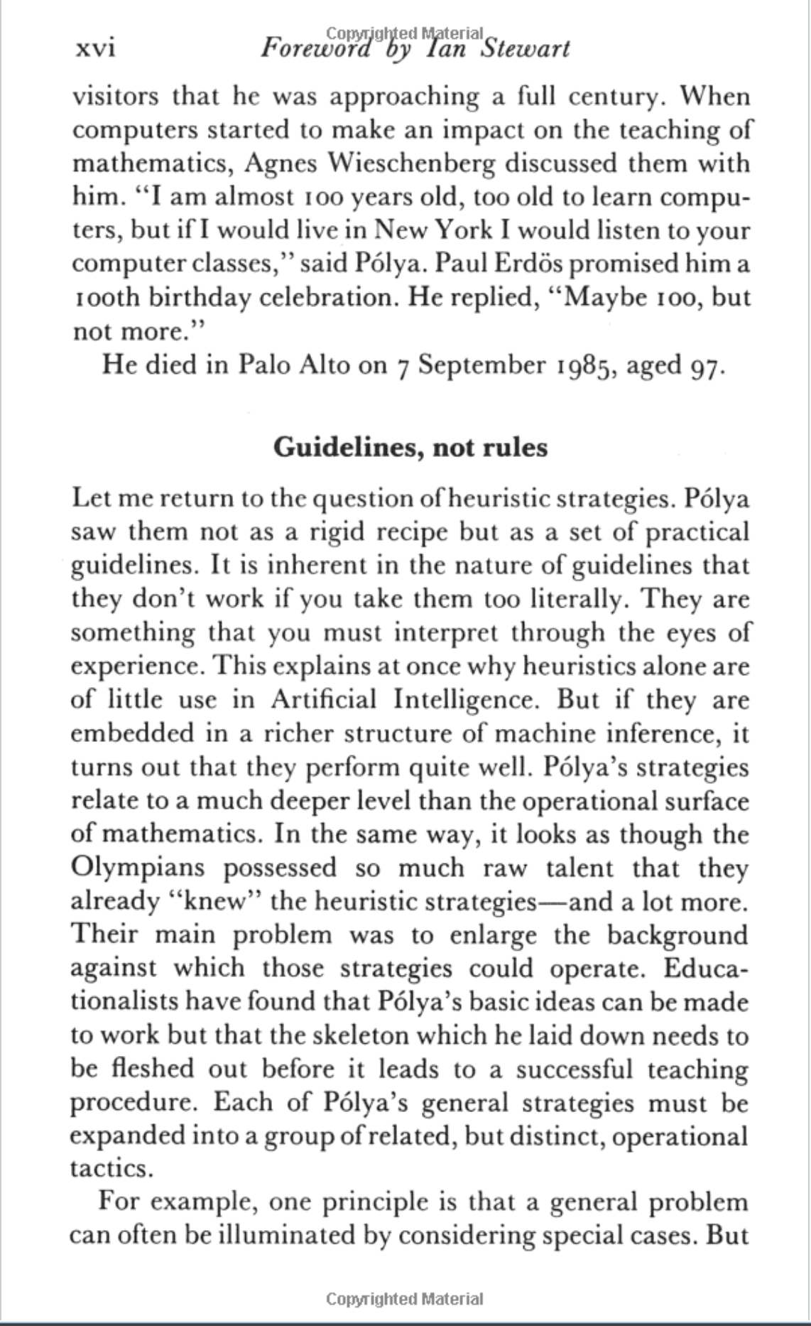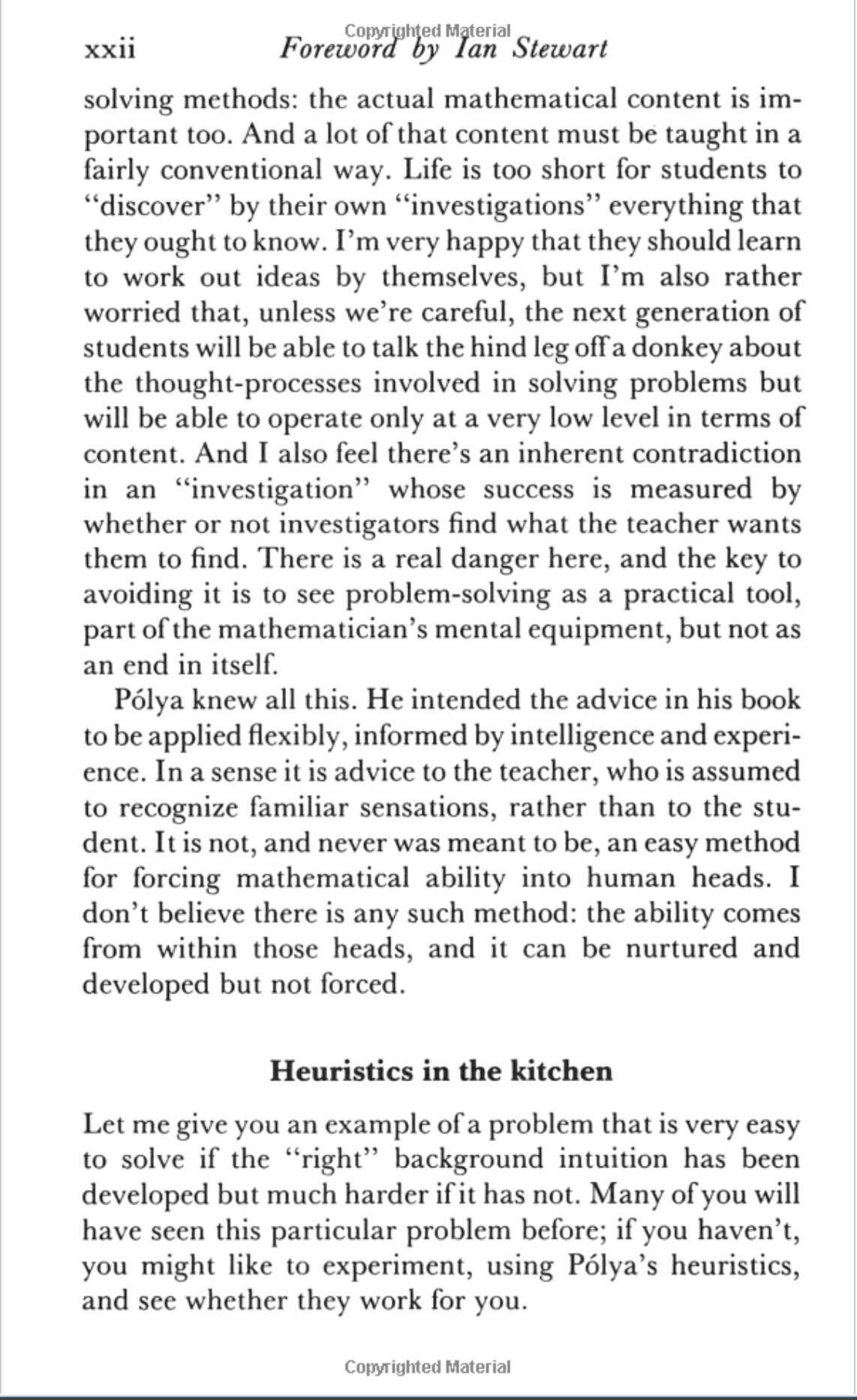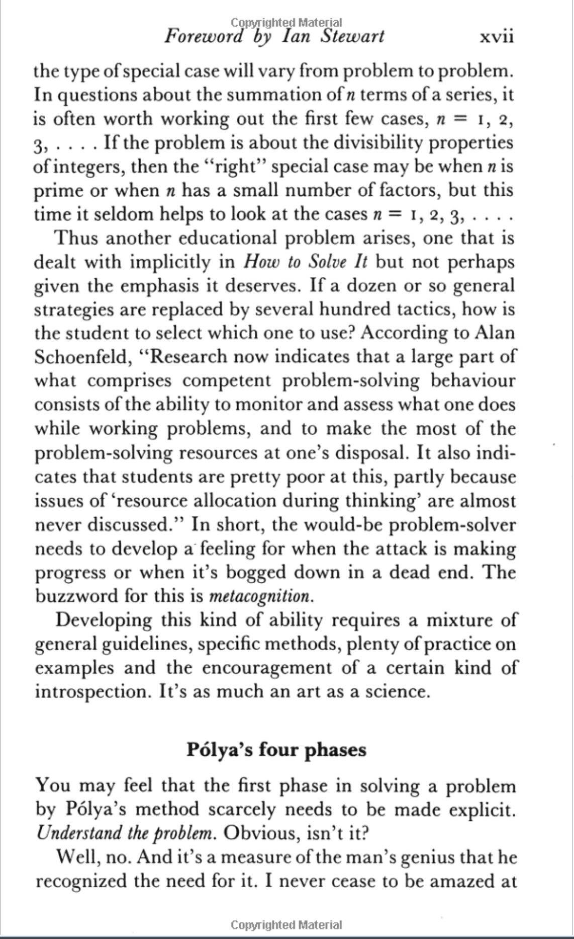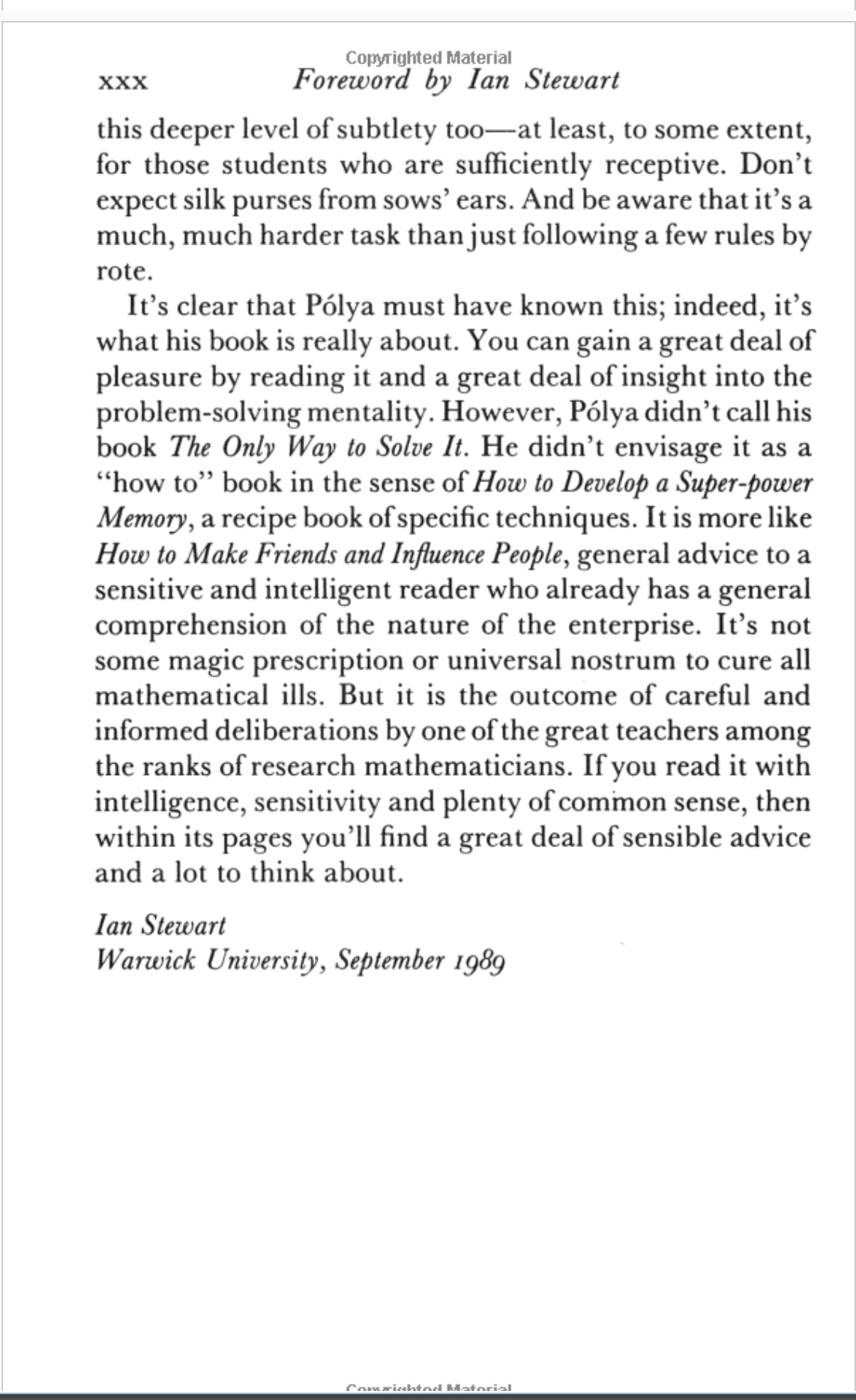 Last year I stumbled across a book that I had heard of in the university library, the 1990 edition of How to Solve It by George Polya. The book itself was good, but nothing I didn't expect. However the foreword keeps coming back to me, to the extent that I find myself looking it up a year later. I managed to find it online so here it is if you want to read it: