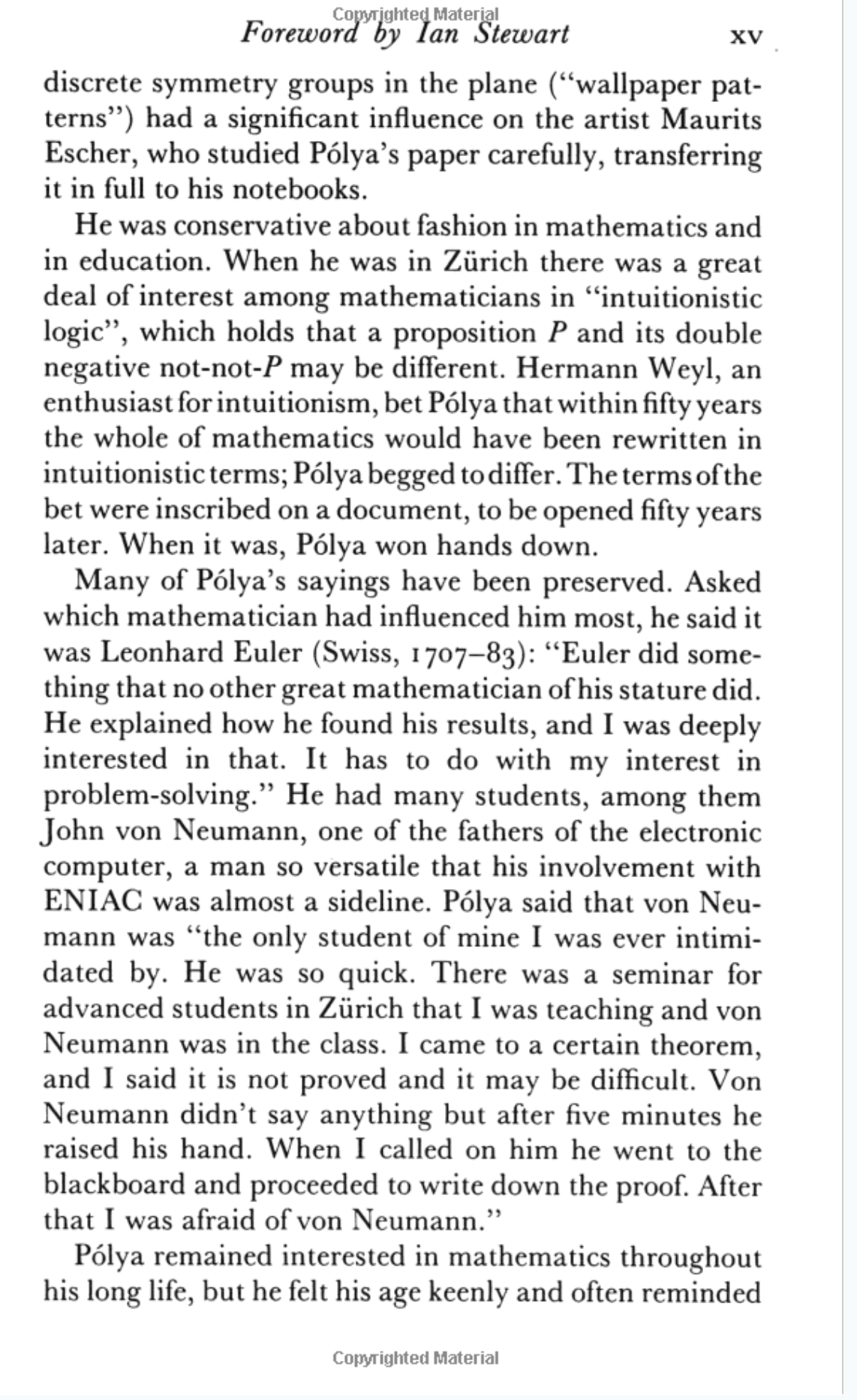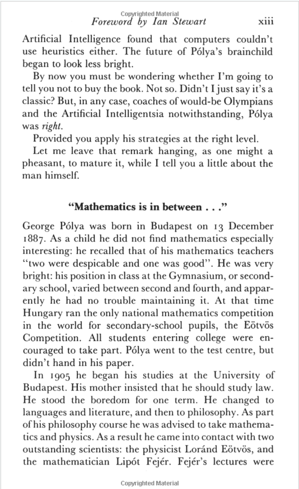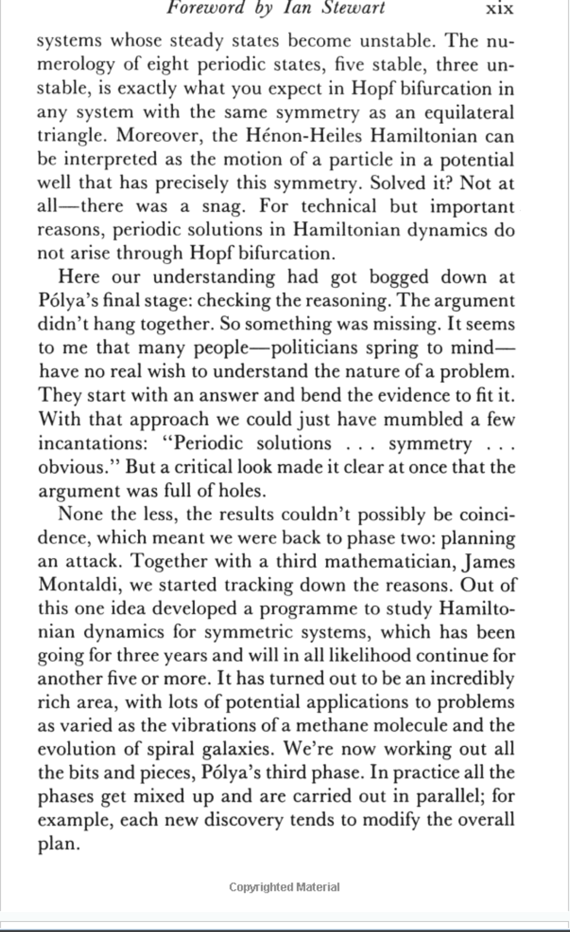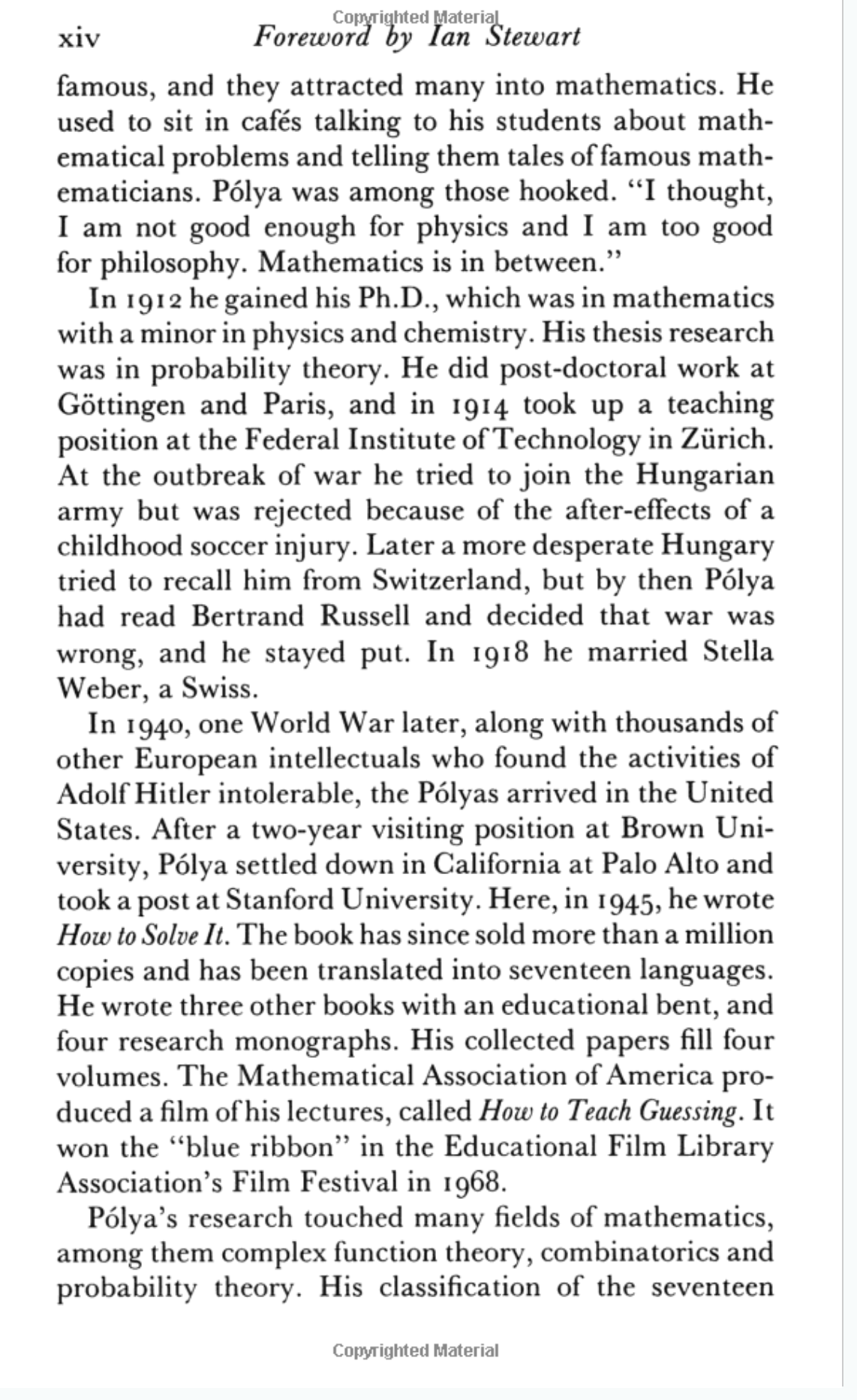 Last year I stumbled across a book that I had heard of in the university library, the 1990 edition of How to Solve It by George Polya. The book itself was good, but nothing I didn't expect. However the foreword keeps coming back to me, to the extent that I find myself looking it up a year later. I managed to find it online so here it is if you want to read it:
